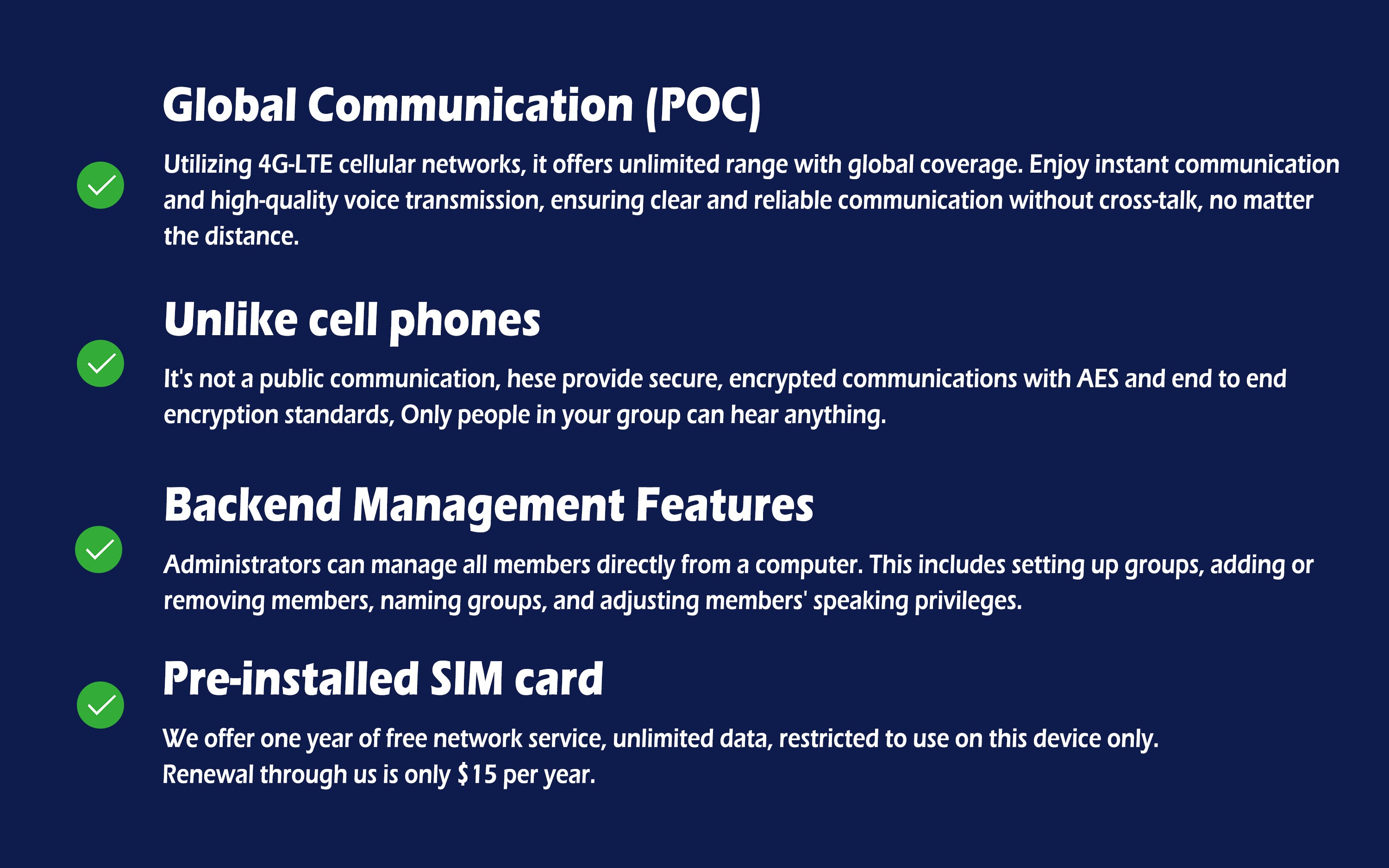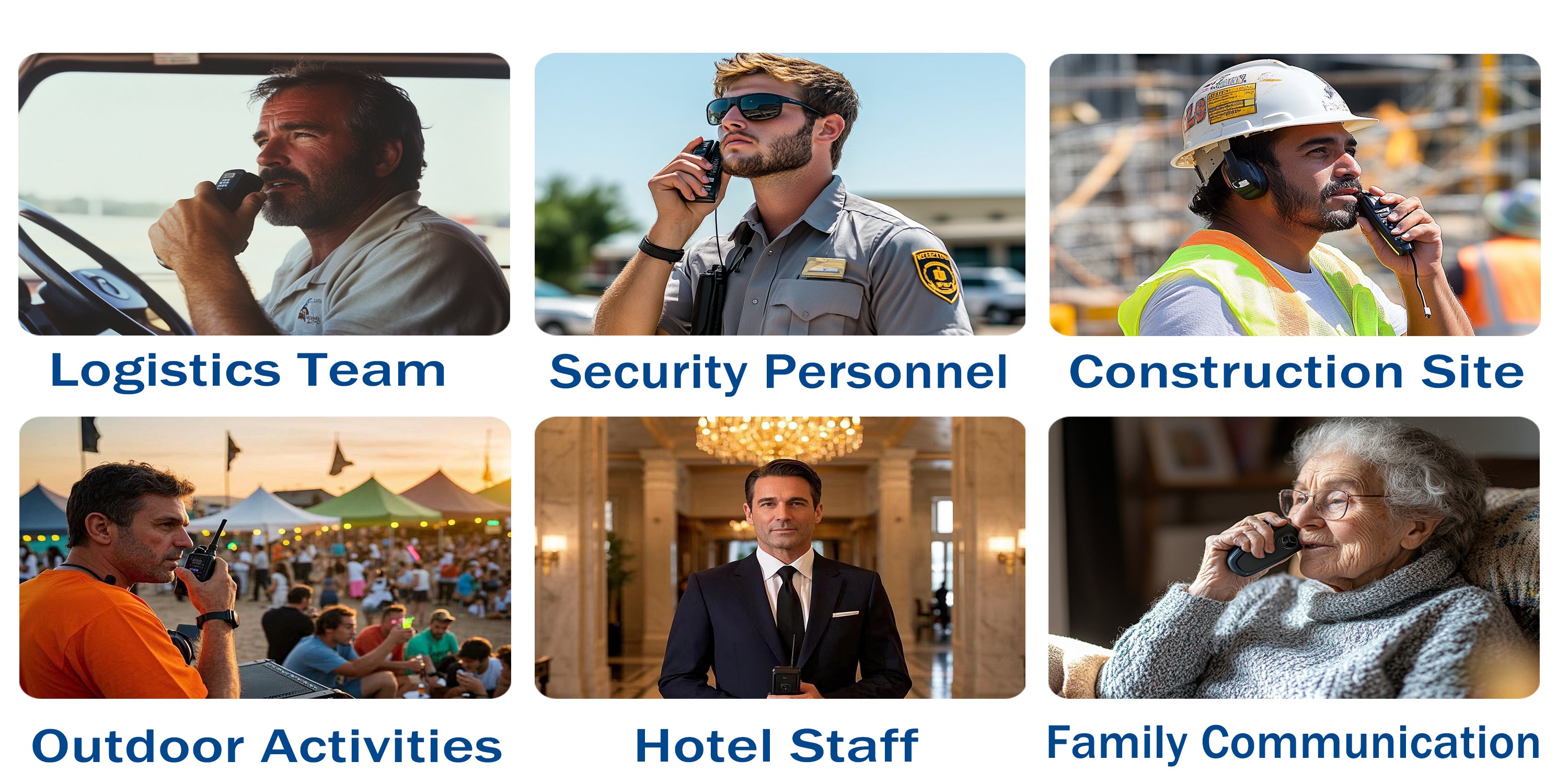 El potente walkie-talkie de modo dual es ideal para diversas situaciones que requieren comunicación instantánea a larga distancia. La función de relé permite al personal en sótanos y túneles comunicarse a larga distancia. Ideal para flotas logísticas, obras de construcción, camping, senderismo y más.