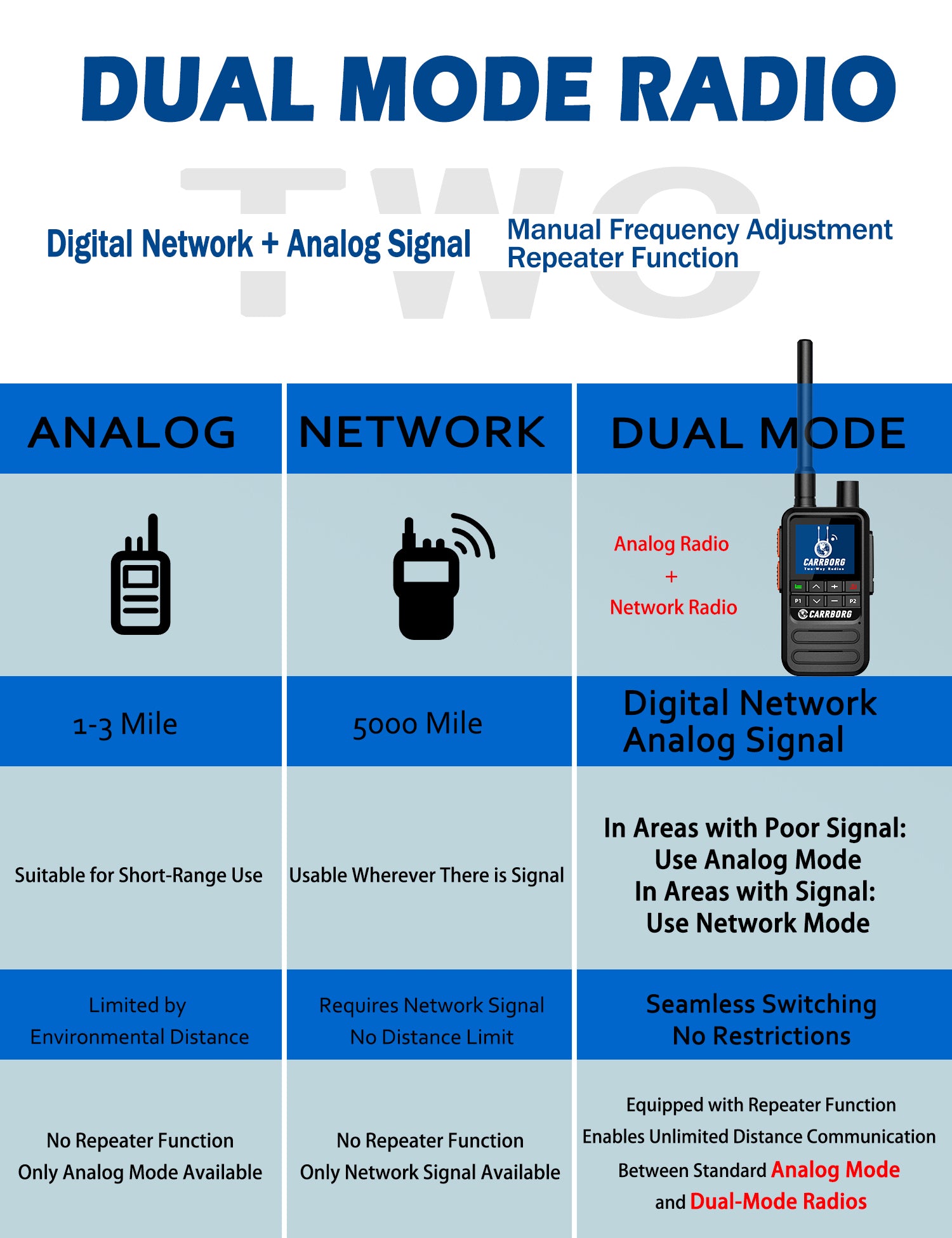 Función de repetidor avanzada : Conecte radios analógicas tradicionales mediante señales UHF a un walkie-talkie de modo dual. Este dispositivo transmite el audio a través de redes celulares a otro walkie-talkie de modo dual en una ubicación remota. El walkie-talkie remoto recibe la señal y la envía de vuelta a la radio analógica original vía UHF, lo que permite la comunicación a larga distancia en tiempo real entre dos grupos de radios analógicas sin acceso directo a la red.